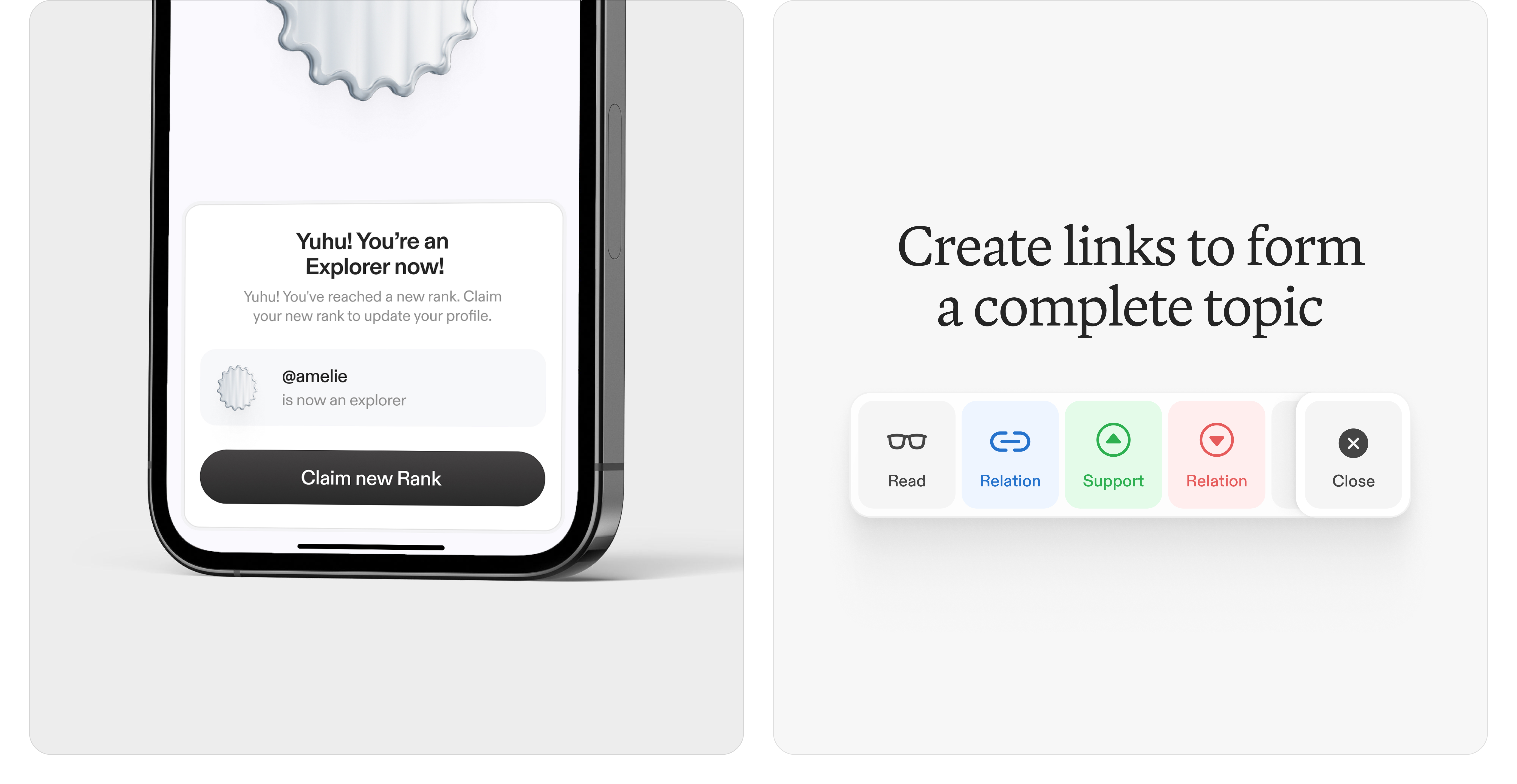 By implementing supportive, contrasting, and relational links, we make content connections to other materials transparent. Additionally, we enable our users to exchange ideas on topics through comments. We harness collective intelligence by utilizing the diverse knowledge of our users to enhance the context on the platform. Through reward systems like "Ranks" or "Achievements," we encourage our users to actively engage with their own and others' content, helping to organize the flood of information and make content more understandable.